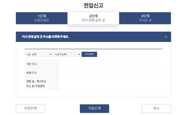 2단계 이사 전에 살던 곳을 입력해주시면 됩니다. 주소 조회를 눌러서 검색 후 선택해주세요.