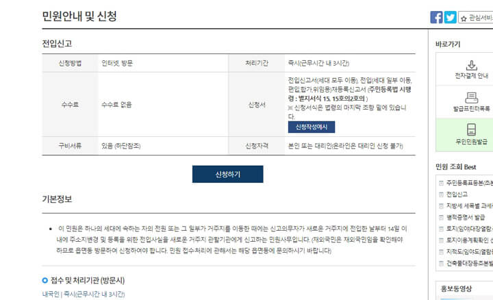 서비스 바로가기에서 전입신고를 클릭해주시면 됩니다.