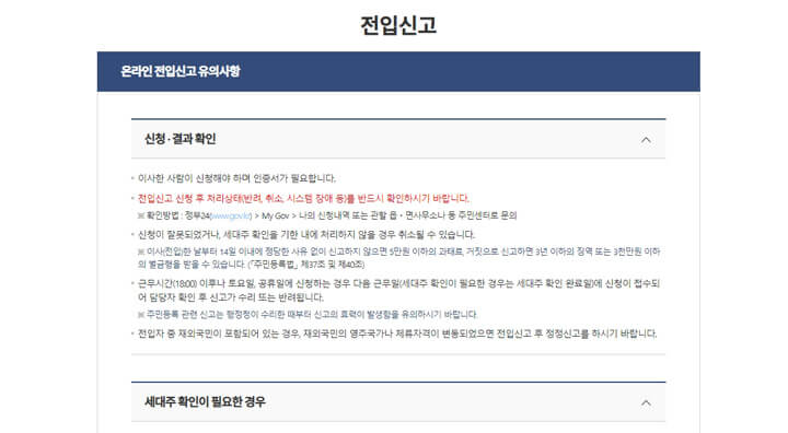 온라인 전입신고에 대한 안내사항을 확인하실 수 있습니다.