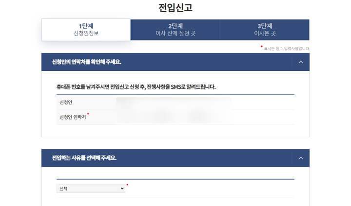 1단계 신청인 정보를 입력해주시면 됩니다. 전입 사유는 본인에 맞는 사유를 선택해주시면 됩니다.